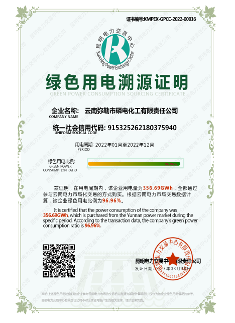 公司有员工600多名,年产黄磷6万多吨,自我配套有宜良对歌山磷矿和10.8万千瓦装机容量的雷打滩水电站,连续五年评为黄磷行业“能效领跑者标杆企业”,荣获红河州重点纳税工业企业、云南省优强民营企业、云南省“五一”劳动奖状等。