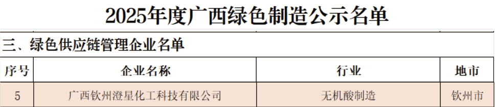 根据广西壮族自治区工业和信息化厅7月25日发布的《2025年度绿色制造名单公示》,广西钦州澄星化工科技有限公司入选省级绿色供应链管理企业名单!这是钦州澄星继2024年连续获得省级、国家级 “绿色工厂”荣誉后,在绿色制造方面取得的又一殊荣。